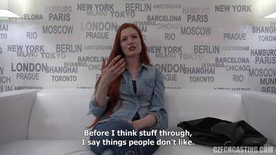 Esta hermosa pelirroja se pone aceite y se mete los dedos en el sofá durante este casting que va muy bien.