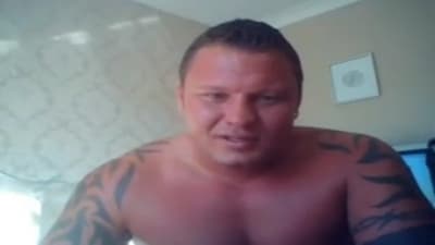 Este tipo tatuado y fortachón nos va a mostrar su gran polla mientras se hace la paja frente a la cámara. El tipo se masturba hasta correrse.