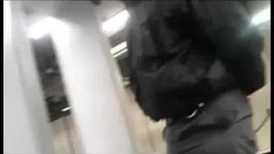 Este policía de banco no sabe que lo están grabando mientras que se le nota que tiene su paquete apretado en los pantalones. Se le nota la erección