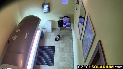 En este solárium, una guarra aprovecha su sesión de rayos UVA para masturbarse profundamente; combinando los negocios con el placer.