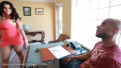 Angelina Castro es una gordita que va a la oficina con su sexy mini vestido y vuelve loco a un negro que le deja sus enormes tetas llenas de semen.
