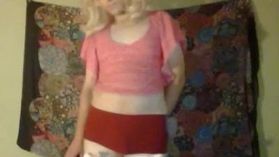 Menudo tío, con peluca rubia y medias blancas mostrando su gran culo asqueroso y jugando con un consolador