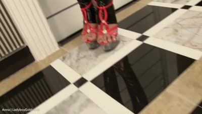A esta trans dominante le encanta la ropa de látex. Ella abre bien el culo y se mete un tapón antes de ser penetrada por la polla del tipo, y recibir semen