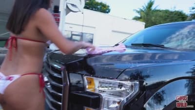 Un grupo de perritas lavan un coche y muestras sus atributos, solo una se va a la grama a masturbarse frente a la cámara, no te la pierdas.