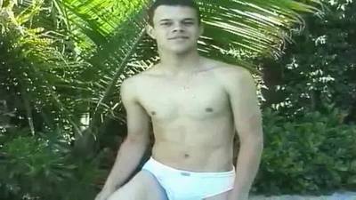 Un chico moreno se quita sus sexis interiores blancos y se masturba la polla en la piscina. Es muy excitante!