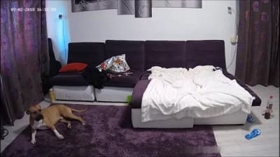 Una joven pareja de aficionados haciendo un reality show donde comparten todo a través de una cámara en la sala de estar junto a su mascota.