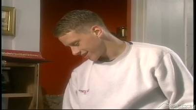 Este par de maricones se están besando en el trabajo cuando alguien toca la puerta, fingen no estar. Despejado el peligro pasan a la sodomía profunda.