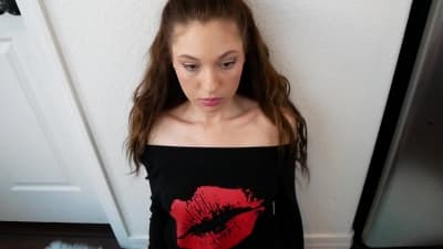 En cuclillas, Anna Blossom lame la polla a su chico y chupa lentamente