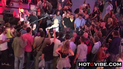 Una gran cantidad de personas va a disfrutar de esta linda rubia que se desnuda y se masturba para ellos.