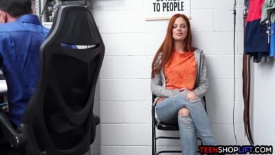 Joven ladrona pelirroja detenida por los vigilantes y follada