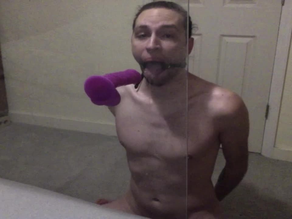 El tipo le pone una bola y una cadena en la boca y las esposas. Chupa un consolador y se lo mete hasta el fondo de la garganta