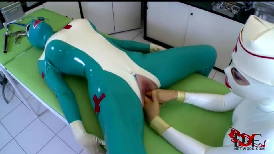 Clanddi se encuentra en una clínica con otra mujer. Empieza a lamer y a meter las manos en el tímido coño de la otra mientras ambas visten un disfraz de látex.