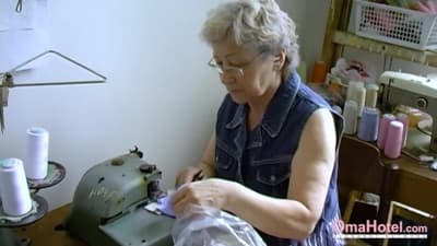Esta vieja costurera se emociona mientras trabaja. Empieza a desnudarse y a acariciarse, luego se mete un consolador en su coño peludo