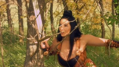 Una vikinga con grandes tetas y un gran culo va a tener sexo con una polla de plástico eyaculadora. Se la va a chupar y le va a hacer una paja española.