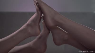 Estas dos lesbianas cachondas con medias sexuales atadas a un consolador para darle la sensación de una polla