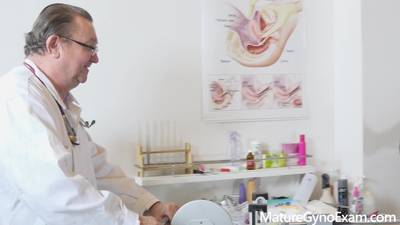 La guapa mujer madura tenía cita con el ginecólogo y se hizo palpar y revisar el coño. Le mete una herramienta que le abre la vagina y la llena de agua.