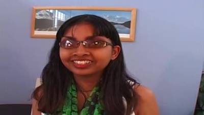 Una mujer indonesia con gafas tiene un coño peludo que muestra tímidamente a la cámara y es persuadida para chupar una polla en POV.