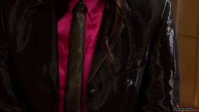 Tres mujeres vestidas con ropa elegante se follan con un arnés. La follada parece ser bastante caliente.