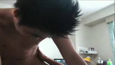 Un gay japonés lame crema batida en el pecho de su hombre. Estos asiáticos están muy excitados y disfrutan estimulando sus culos.