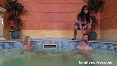 Una vieja zorra complace a los amigos de su nieto con una mamada en la piscina. Se la cogerán entre tres.