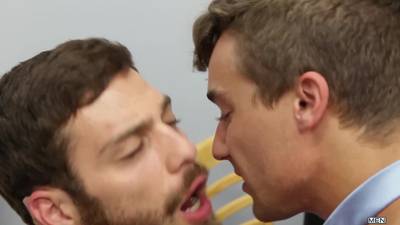 Estos tres guapos ni siquiera se quitan el traje para chuparse la polla y follarse el culo durante la hora de la comida en la oficina!