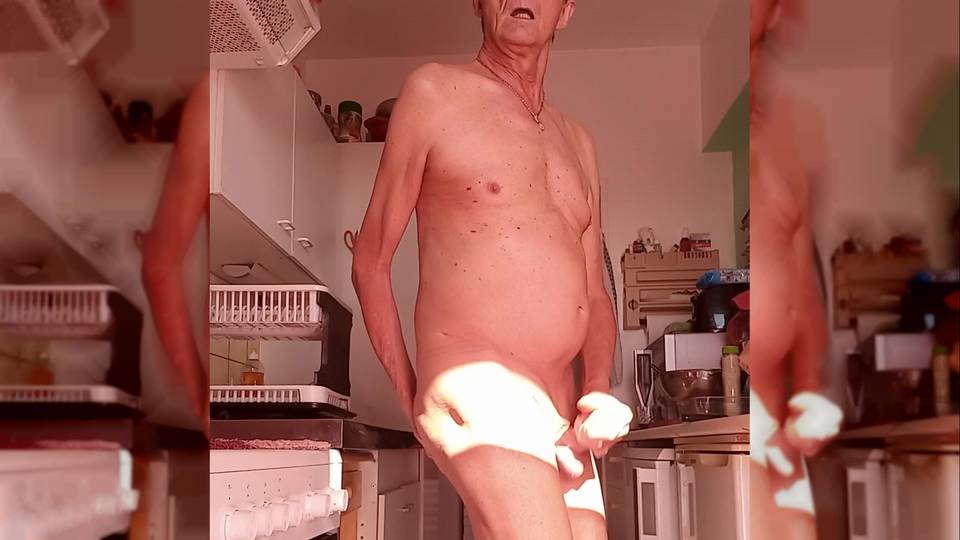 Viejo jugando con su polla en la cocina de su casa disfrutando de la buena sensación antes de correrse mientras graba en la cam