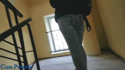 Una joven zorra se encuentra con un tipo en la escalera. Él saca una gran polla, ella se baja las bragas para que él pueda mirar su coño y se corre!