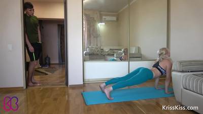 Una bonita chica rubia practica yoga en una colchoneta. Al verla, el tipo se excita y le baja los leggings y se la folla por el culo.