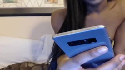 Una guapa morena trans con tetas pequeñas, recibe una petición de su novio. Ella masturba su polla mostrándosela por teléfono!