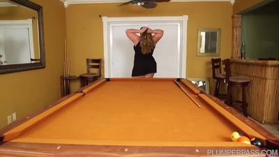 Buena BBW blanca juega con el taco de billar, si no también la BBC que ella toma en su coño sobre la mesa. Ella toma una eyaculación en sus tetas