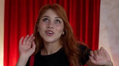 La pelirroja Marina Gold, se quita el vestido y abre las piernas, para tocarse los labios afeitados de su coño rosa!
