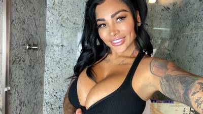 La bella latina, morena de grandes tetas y gran culo, tiene el cuerpo cubierto de hermosos tatuajes, deseosa de mostrar este tesoro y de masturbarse.
