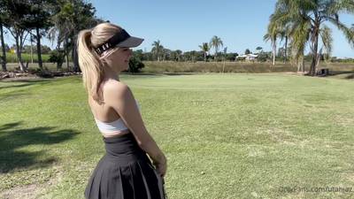 Una joven rubia conoce a un chico guapo en el campo de golf. Ambos eligen tener sexo en lugar de jugar. Mira mamadas y posturas para follar en el coche!