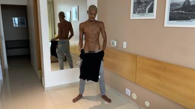 El actor porno gay amateur de Brasil, Yuri Oberon, se desnuda y masturba su larga polla negra, mientras está frente al espejo excitándose con sus manos.