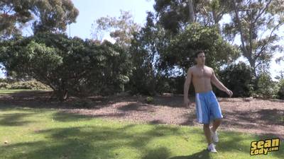 En medio de un parque público, Tyler se quita la camisa para ponerse a entrenar el futbol, pero no durará mucho sin que le den ganas de hacerse una paja.