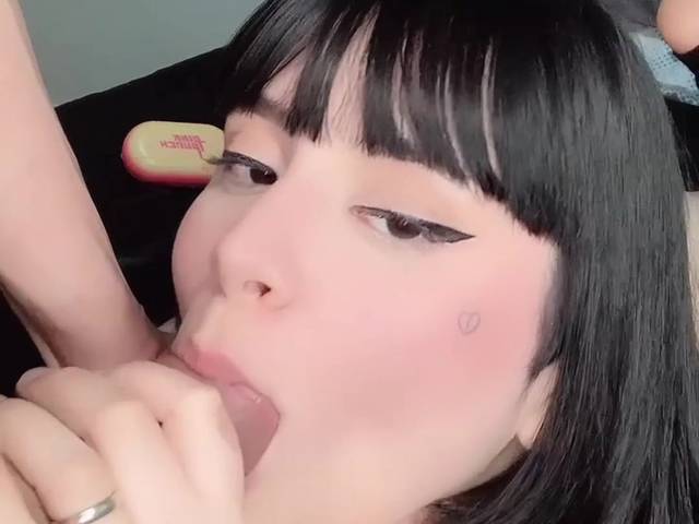 Hermosa morena en sexy traje negro, se arrodilla frente a su amante y toma su polla en la boca hasta que eyacula.