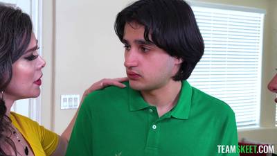 Gal Ritchie y Nicole Emma se divierten con su hijastro. Empiezan a desnudarlos! Le hace una garganta profunda mientras la madrastra le chupa el coño