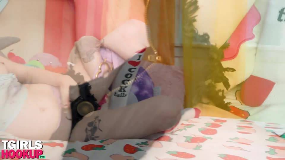 Es que a esta transexual le fascina el sexo anal y al estar sola se mete su enorme juguete por el culo poniéndose en la posición del perrito en cámara.