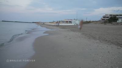 Llevando una máscara, esta chica desnuda caliente, chupa a un hombre en la playa, durante la salida del sol y le deja eyacular por todas sus hermosas tetas.