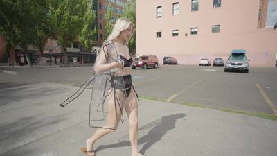 La joven rubia sólo llevaba bragas. Cubre su cuerpo curvilíneo con un abrigo transparente y se pasea por el paseo marítimo, para que todos le vean el cuerpo.