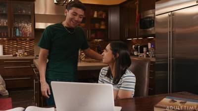 Max pilla a Hailey Rose masturbándose mientras ve porno. Ella es lesbiana pero está interesada en sentir una polla así que recrean el porno que estaba viendo