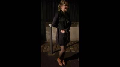 Parece que esta joven rubia se ha encontrado a un viejo amigo en la calle al volver de la discoteca. Allí mismo se arrodilla para mamarle el pene hasta correrse