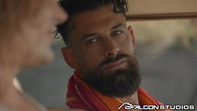 Rubio tocándose los pezones mientras le chupa la polla un barbudo