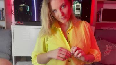 Este hombre está viendo una película cuando llega su novia. Ella se excita con él, le enseña sus grandes tetas y le practica sexo oral hasta que se corre.