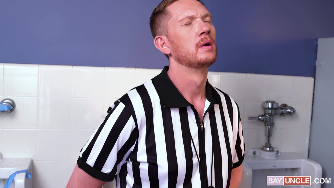 Este árbitro macho encontró a un chico en los baños así que saca su polla y empieza a chupar su polla peluda y luego le hace chupar su pene!