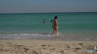 Su primera vez en la playa nudista y se graba en topless en selfie