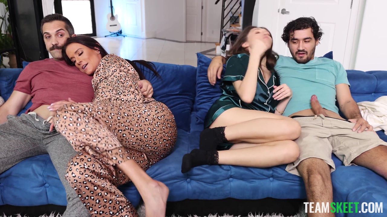 Sofie Marie y Maya Woulfe están una al lado de la otra con sus novios. Las cosas se calientan y de repente se las follan una al lado de la otra en el mismo sofá