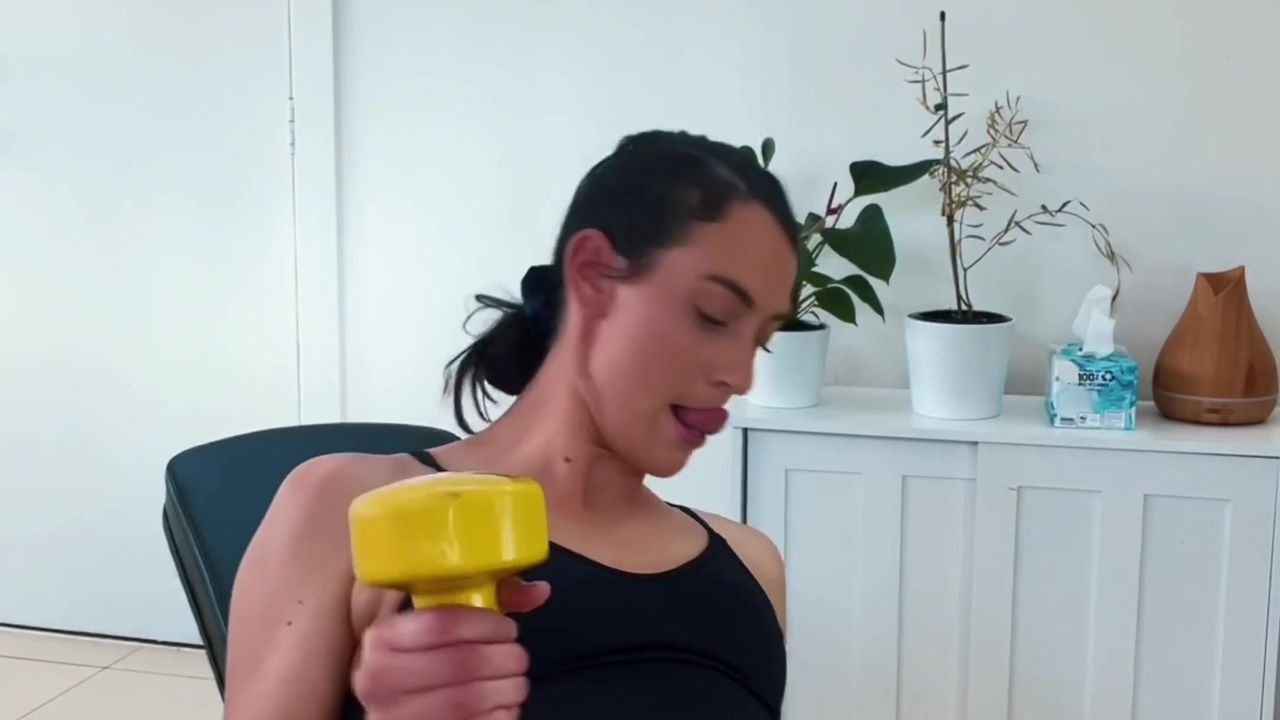 Al empezar a hacer ejercicios se desnuda y se mastruba con juguetes