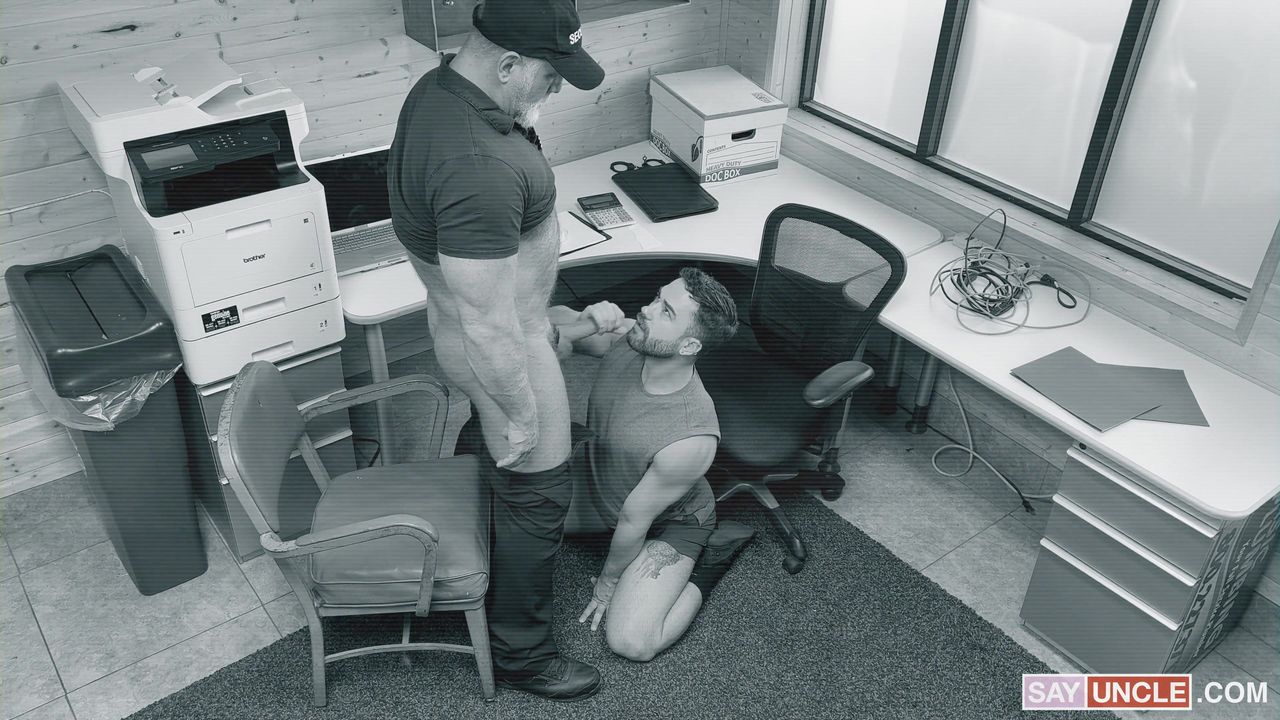 Este guardia DILF sorprendió a este tipo robando. Le suplica que no llame a los policías y para obtener su libertad, se pone de rodillas para chupar la polla