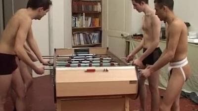 Esta será una noche solo de chicos, y es por eso que estos amigos se divierten jugando en casa, pero a medida que se van quitando la ropa se van excitando, hasta que quieran follarse.